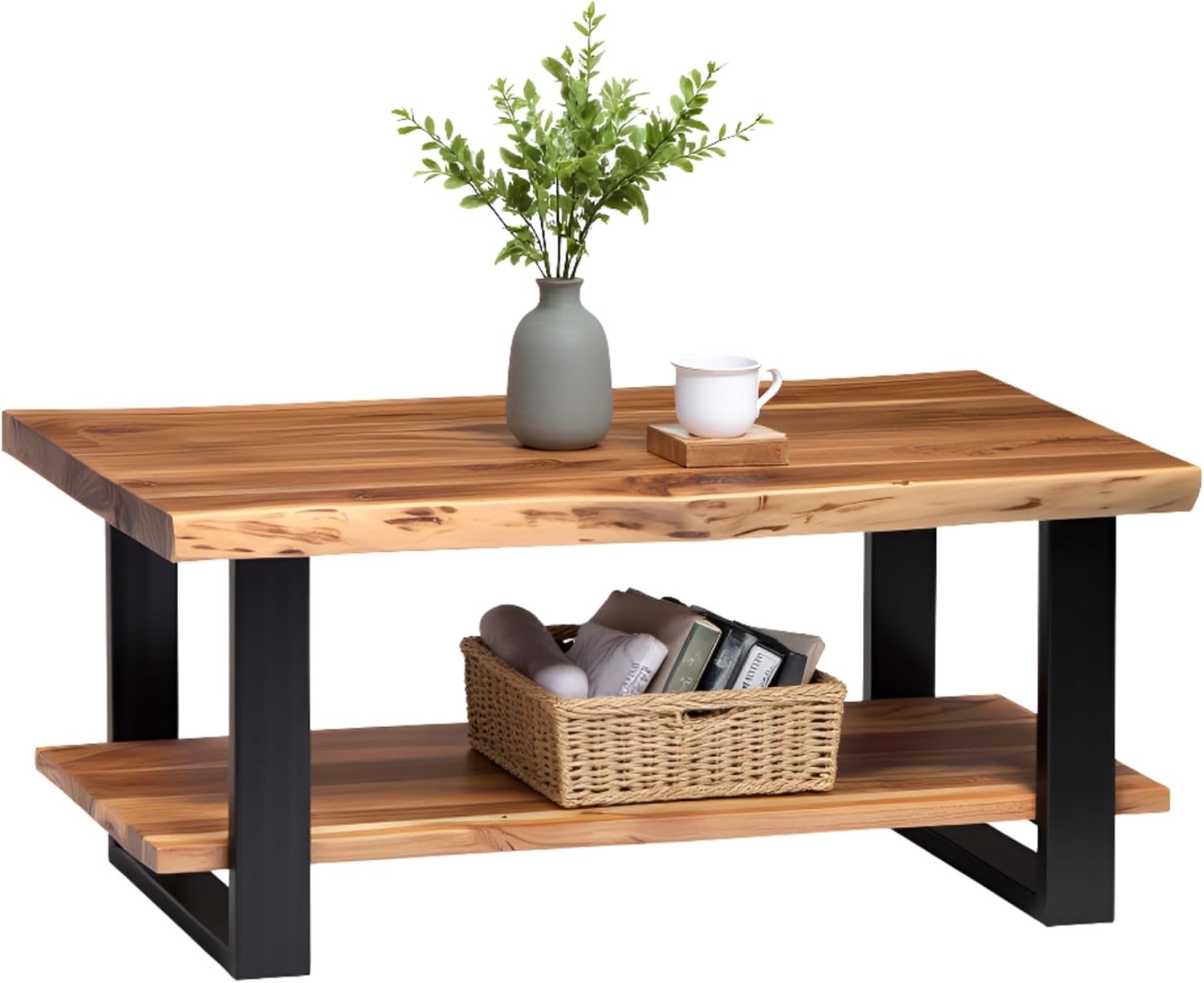 Bring warmth and character to your living space with the Alpine 2-Tier Live Edge Coffee Table. Crafted from richly grained solid acacia wood with a natural finish, each piece showcases unique organic edges for a one-of-a-kind look. The sturdy black metal frame adds an industrial touch, while the lower shelf provides functional storage for books, baskets, or décor. Perfect for living rooms, lofts, or home offices, this 42-inch statement table blends rustic charm with modern durability for timeless everyday use.